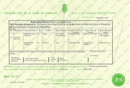 Головне реєстраційне бюро Великої Британії і країн Співдружності надало виданню копію свідоцтва про шлюб принца Гаррі та Меган Маркл. Цей документ підтвердив, що закохані дійсно одружилися в день видовищного королівського весілля, за яким спостерігали люди з різних куточків планети.