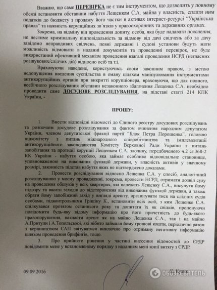 Військовий прокурор сил антитерористичної операції Костянтин Кулик подав заяву в Національне антикорупційне бюро України з вимогою заарештувати народного депутата від «Блоку Петра Порошенка» Сергія Лещенка на час розслідування законності отримання Лещенко коштів на покупку квартири в центрі Києва.