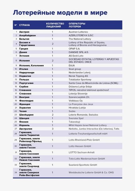«Монопольна модель працює в понад 20 країнах Європи - таких як Німеччина, Франція, Великобританія, Норвегія, Польща, Данія і т.д. У Німеччині та Франції десятки років працює одна компанія, в Англії ліцензія продовжується кожні 6-10 років, але отримує її останні 20 років одна компанія. У Польщі існує державна монополія на лотереї, і ця діяльність взагалі не підпадає під дію антимонопольного законодавства. Компанія Totalizator Sportowy - єдина, якій дано право продавати лотереї. Монополія прийнята і у Франції, в якій працює один оператор Française des Jeux (FDJ)», - зазначається в статті.