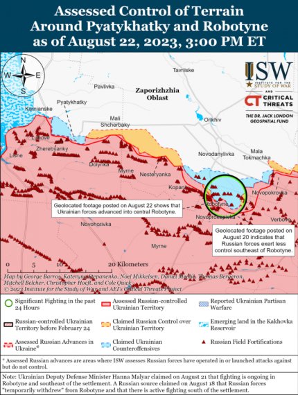 ЗСУ станом на 22 серпня продовжували наступати в районі Роботиного та навколо нього на заході Запорізької області на тлі ознак того, що російські війська, ймовірно, мають обмежену присутність у населеному пункті.