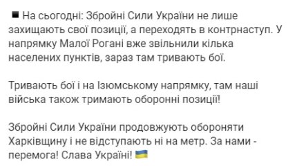 На сьогодні Збройні Сили України не лише захищають свої позиції, а переходять в контрнаступ. У напрямку Малої Рогані вже звільнили кілька населених пунктів, зараз там тривають бої. Тривають бої і на Ізюмському напрямку, там наші війська також тримають оборонні позиції. Харків вночі було обстріляно "лише" 24 рази", - йдеться в повідомленні Олега Синєгубова.