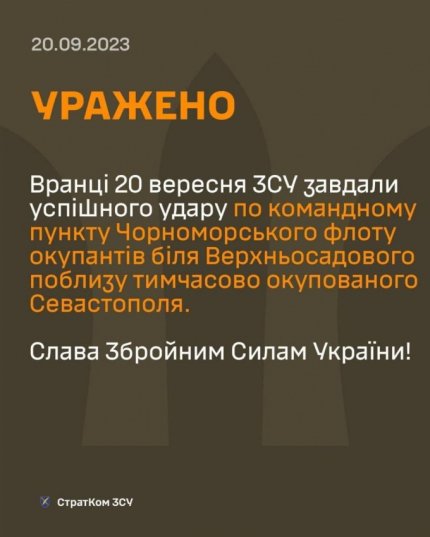 Вранці 20 вересня ЗСУ завдали успішного удару по командному пункту Чорноморського флоту окупантів біля Верхньосадового поблизу тимчасово окупованого Севастополя. Слава Збройним Силам України! - йдеться в заяві СтратКому ЗСУ.