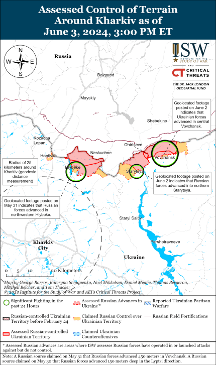 Додаткові кадри з геолокацією, опубліковані 3 червня, показують, як російські та українські сили ведуть рукопашний бій уздовж вулиці Духовної, що дає змогу припустити, що Сили оборони України контратакують, щоб повернути контроль над позиціями.