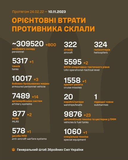 Як зазначає Генштаб, Сили оборони за добу знищили 800 російських загарбників, а з техніки знищено: