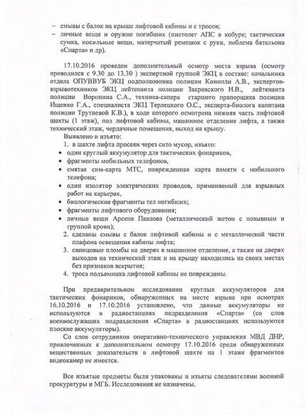 Всі знайдені кулі і речі вилучила "військова прокуратура" і "МГБ" угруповання, при цьому відеокамер на місці вбивства не було, охорона була знята. У той же час, в документі детально описано місце вибуху і виявлені речовини, а також "ізолятор електричних проводів, який застосовується для вибухових робіт на кар'єрах", що може наштовхнути на думку, що вибух організовували не фахівці, а "диверсанти".